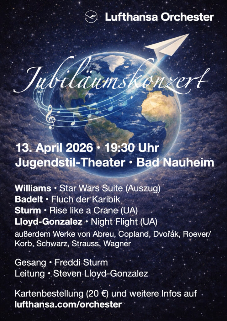 Am 13. April hebt das Lufthansa Orchester im Jugendstil- Theater in Bad Nauheim zu einem musikalischen Sonderflug ab: Das Frühjahrskonzert wird zu einer Reise durchs Weltall, über Kontinente und in Klangwelten. Anlass genug gibt es gleich doppelt— die Deutsche Lufthansa feiert ihr 100- jähriges Jubiläum und das Orchester blickt auf 15 Jahre musikalische Fluggeschichte zurück. Zwei Jubiläen, ein Flugplan und ein Programm, welches ganz im Zeichen der Fliegerei steht.